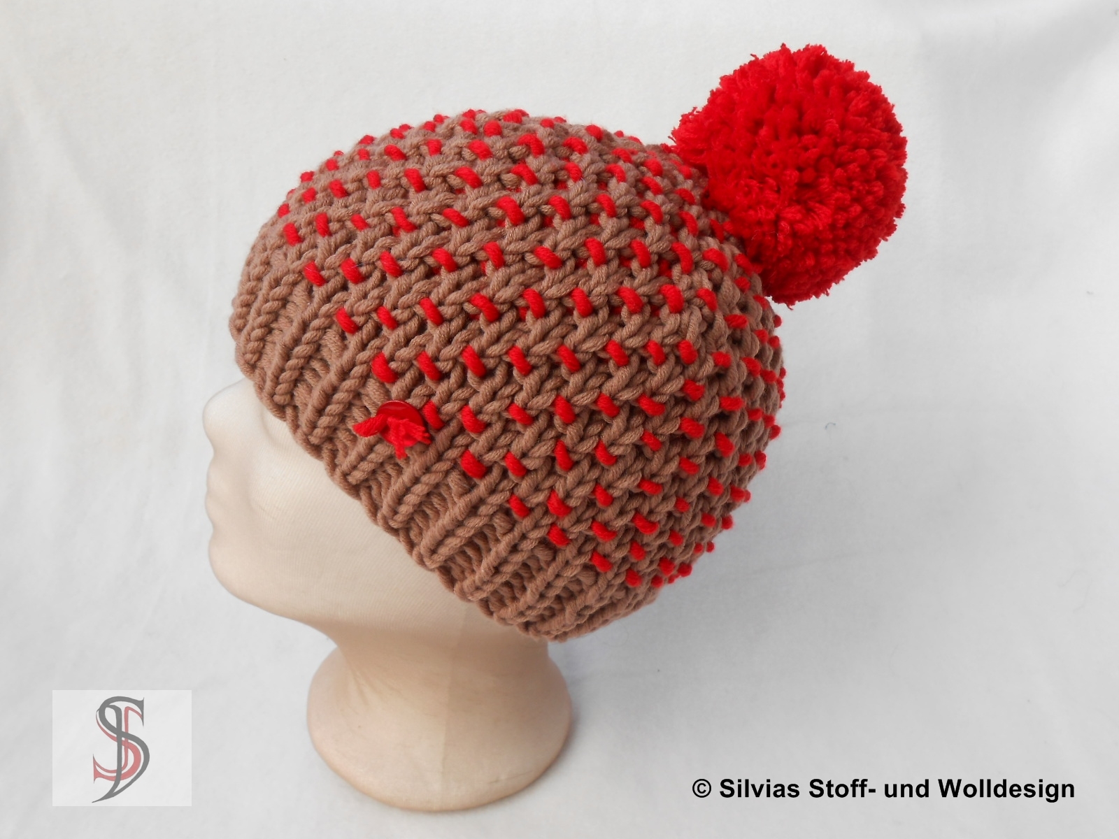 Ich bin ein großer Biathlon-Fan. Jedes Jahr gehe ich zusammen mit Freunden ins Biathlonstadion in Oberhof. Damit wir uns alle leichter wieder finden, habe ich für alle einheitliche Mützen gestrickt. Ich habe mir ein Muster ausgesucht, dass für Männer und Frauen geeignet ist. Das Pünktchenmuster fand ich sehr passend, da es aussieht wie viele kleine Schneeflocken und die weiße Bommel wie ein Schneeball auf der Mütze.