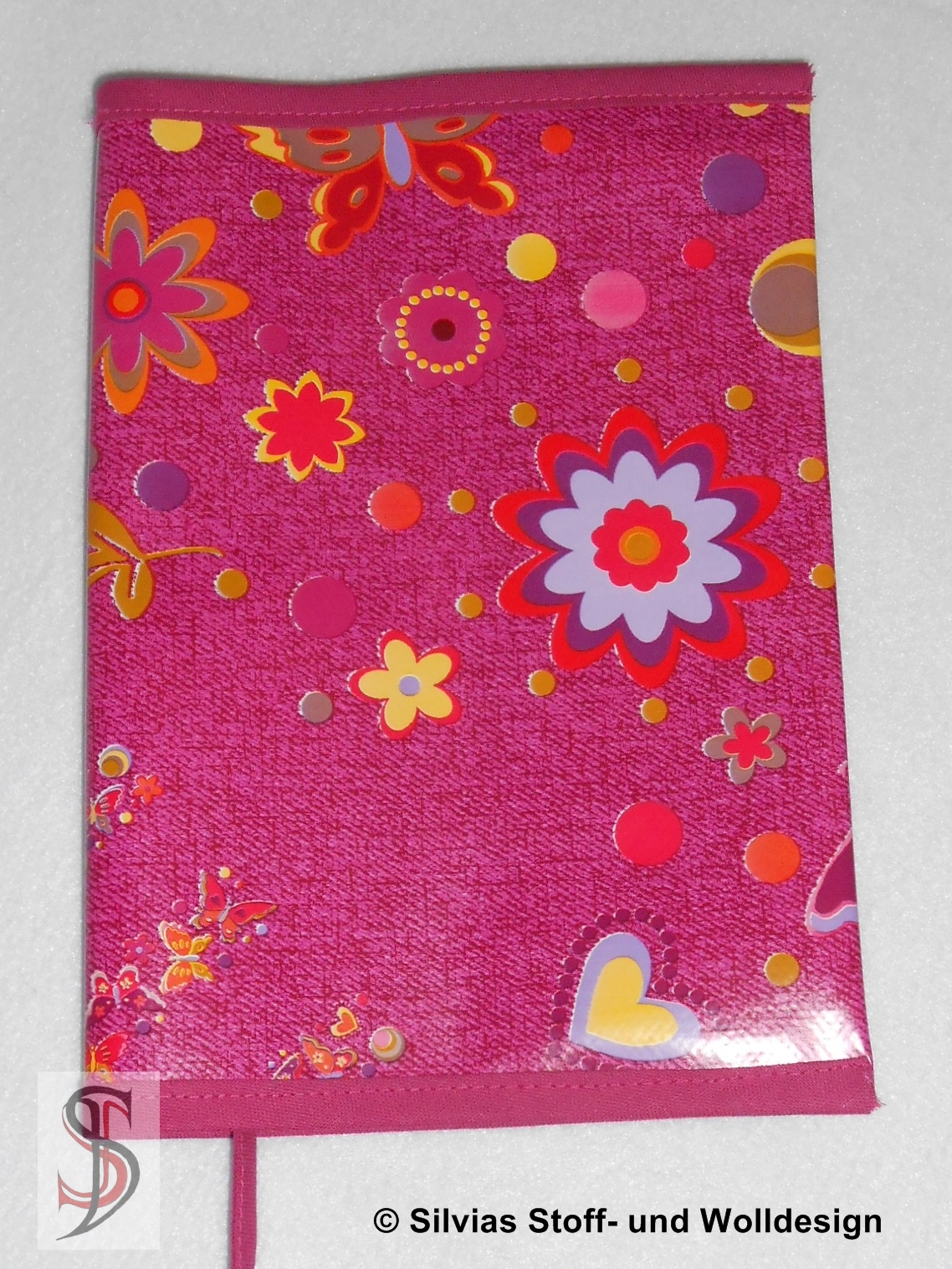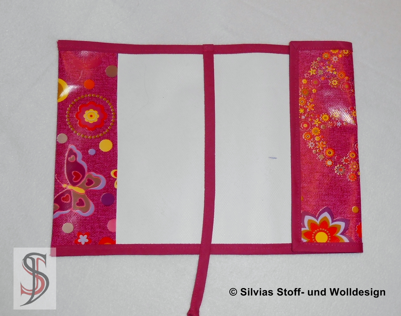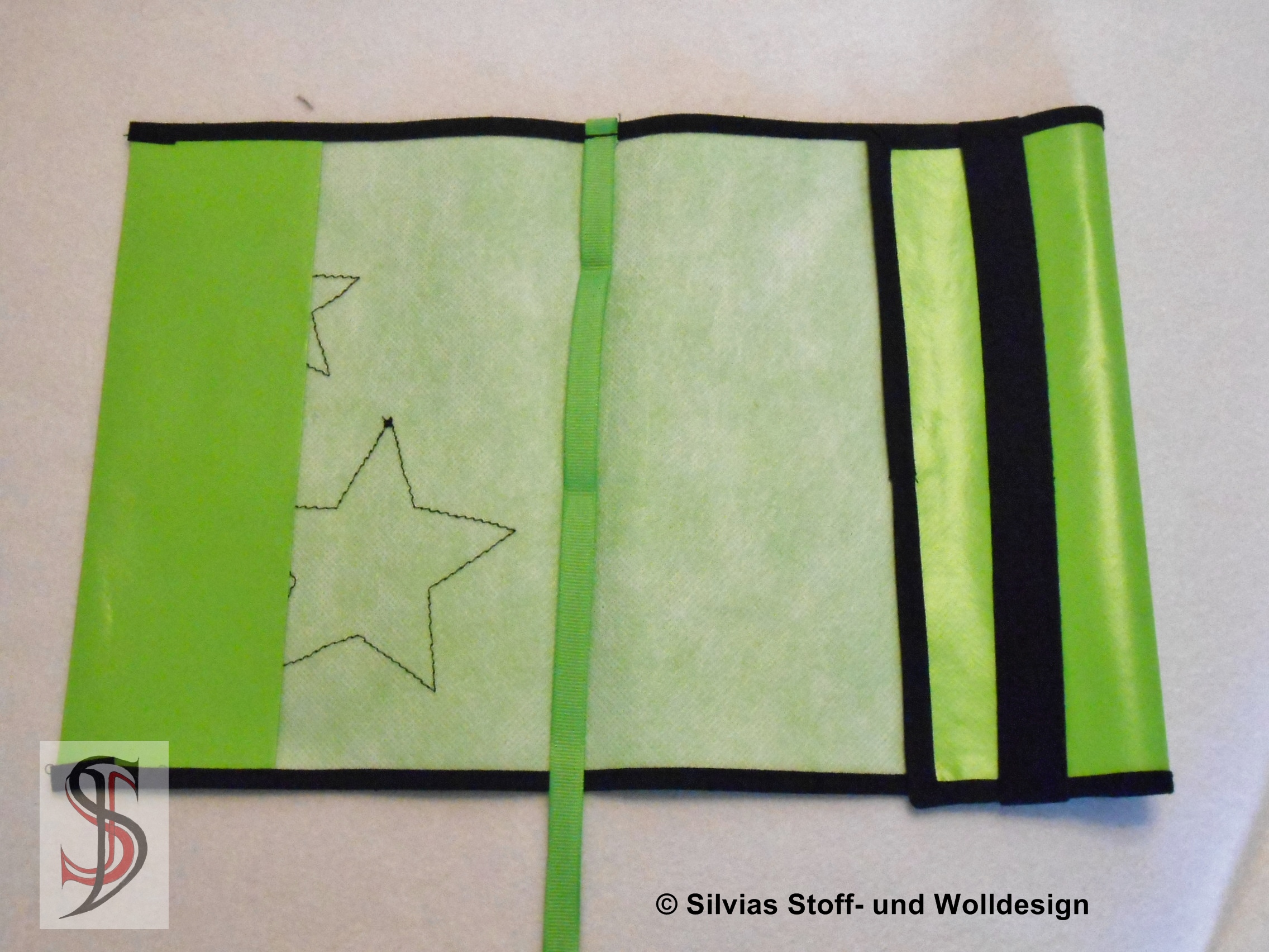 Die Buchhüllen in der Anleitung sind für eine Buchhöhe für ca. 19 cm – also für das Taschenbuchformat. Man kann sie sich natürlich für jede Buchgröße anpassen. Für eine variable Buchdicke ist die hintere Lasche offen. Sie wird lediglich mit einem Gummiband befestigt. Und ganz wichtig – an der Buchhülle ist gleich eine Band als Lesezeichen angenäht.