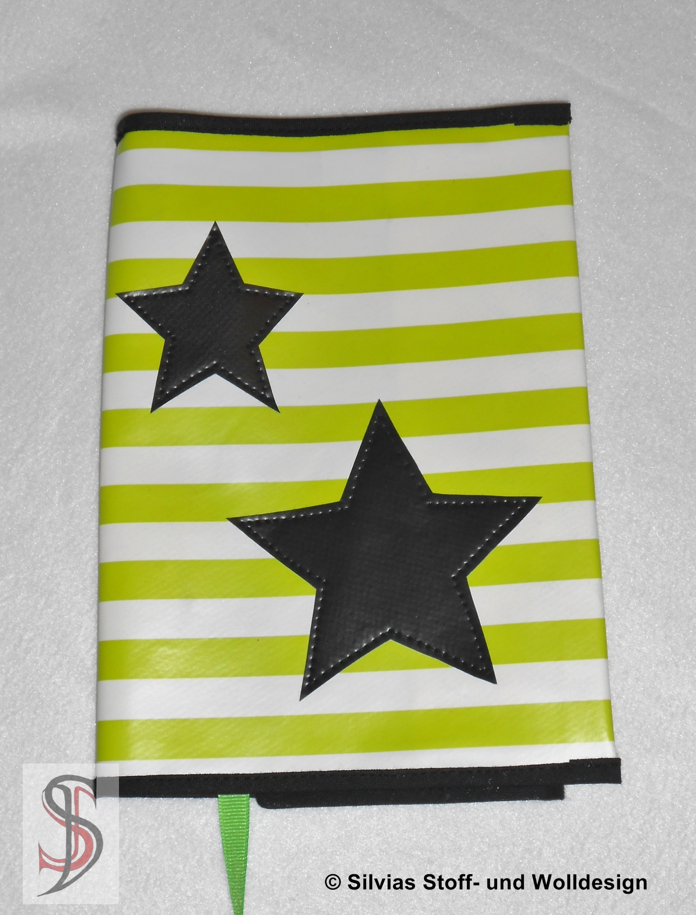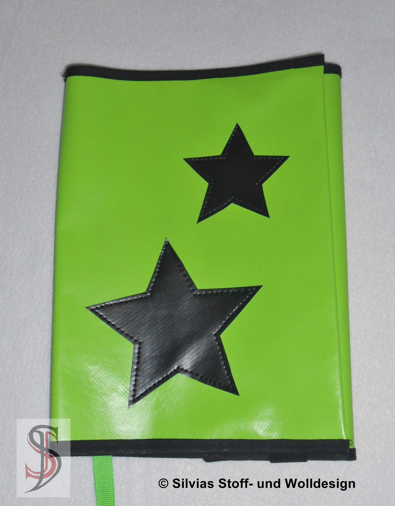 Das Schöne an dem Wachstuch ist, dass man es offenkantig verabeiten kann. So kann man alle möglichen Applikationen zuschneiden und diese einfach auf die Buchhülle nähen. Ich habe mich für Sterne entschieden.