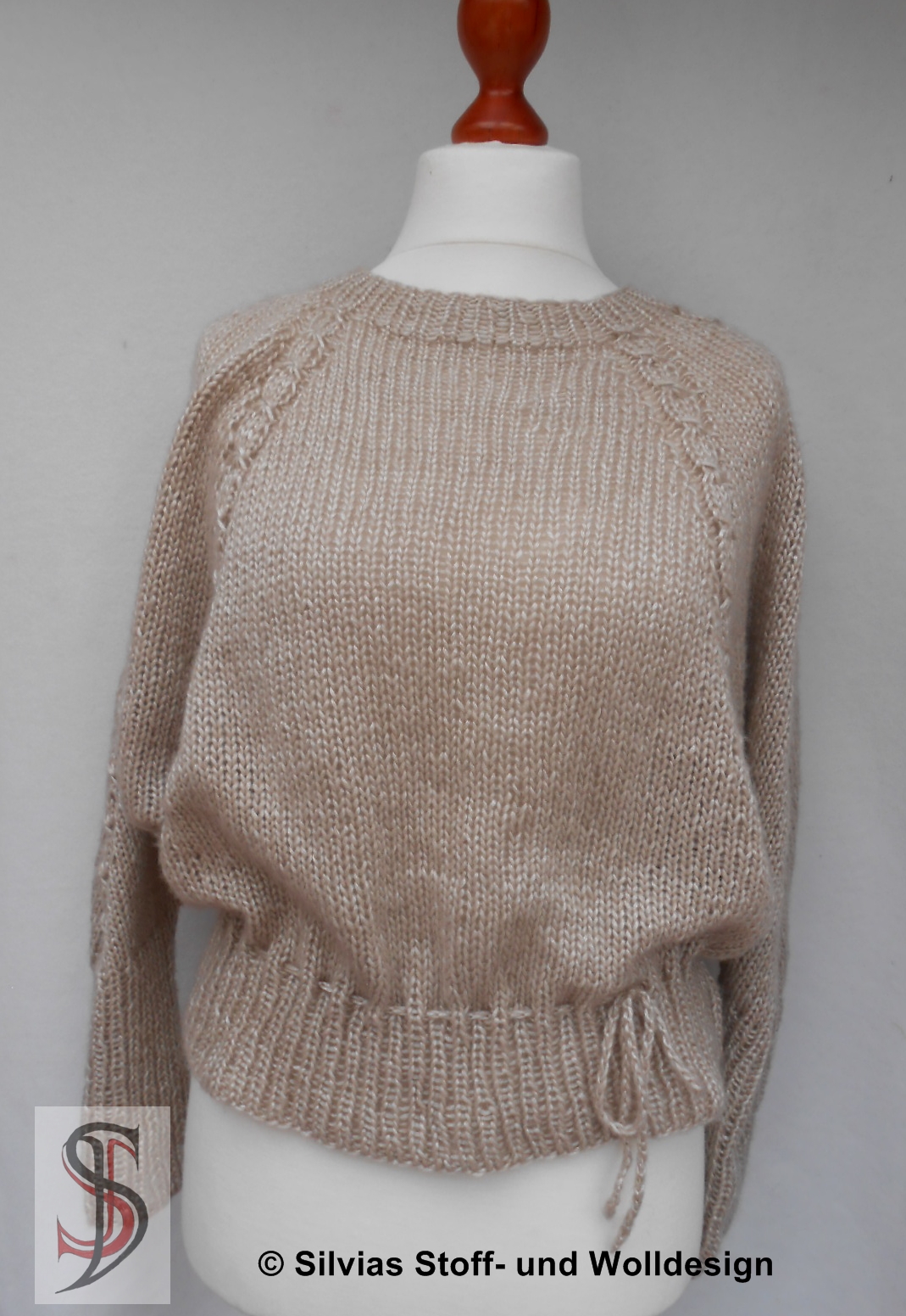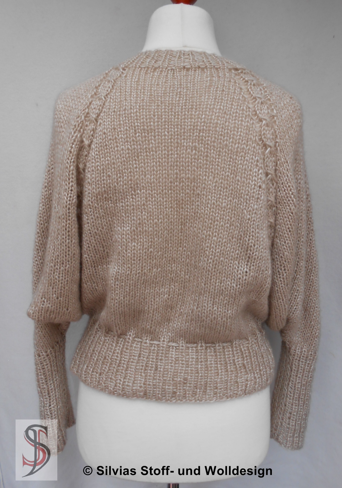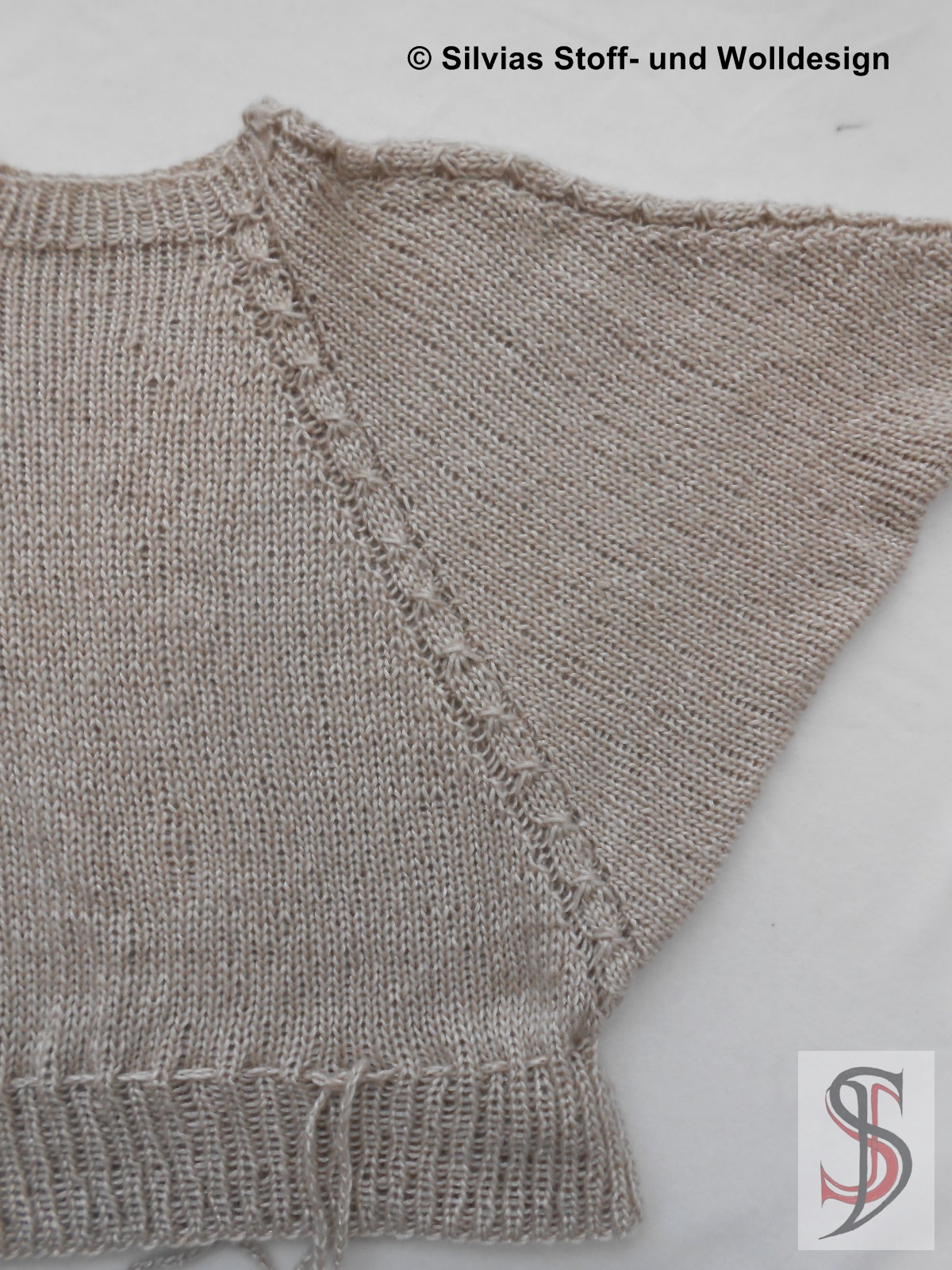 Swoncho 1Aus dem vorderen und hinteren Mittelteil wird mit 146 M ein Bund (1 li, 1 re ) mit 20 R gestrickt. Die Ärmel werden mit jeweils 37 M und 40 R gestrickt und die restlichen M werden unten zusammengenäht. Nun noch eine Luftmaschenkette als Band häkeln und unten in den Swoncho einfädeln. Fertig ist der Swoncho!