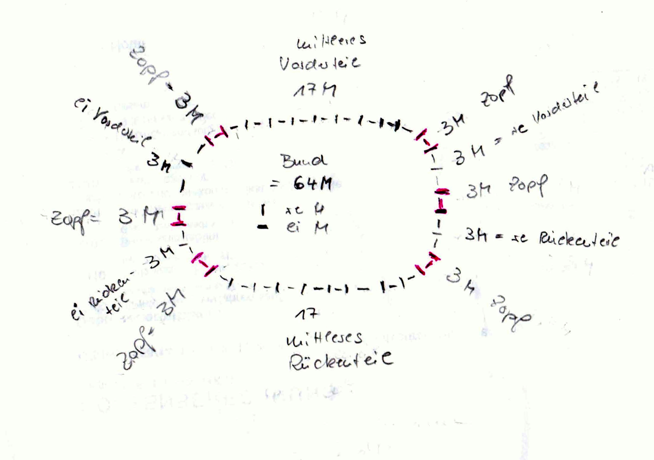 Also 64 M anschlagen und und zur Runde schließen und 10 R 1 M li, 1 M re im Wechsel. Dann die Maschenaufteilung wie folgt: Swoncho 2Der Zopf wird aber kein richtiger Zopf, sondern in jeder 6. Reihe werden die 3 M re zusammengestrickt, die Maschen bleiben auf der linken Nadel – dann eine Umschlag – und die 3 M nochmal re zusammenstricken = 3 M auf der Nadel.