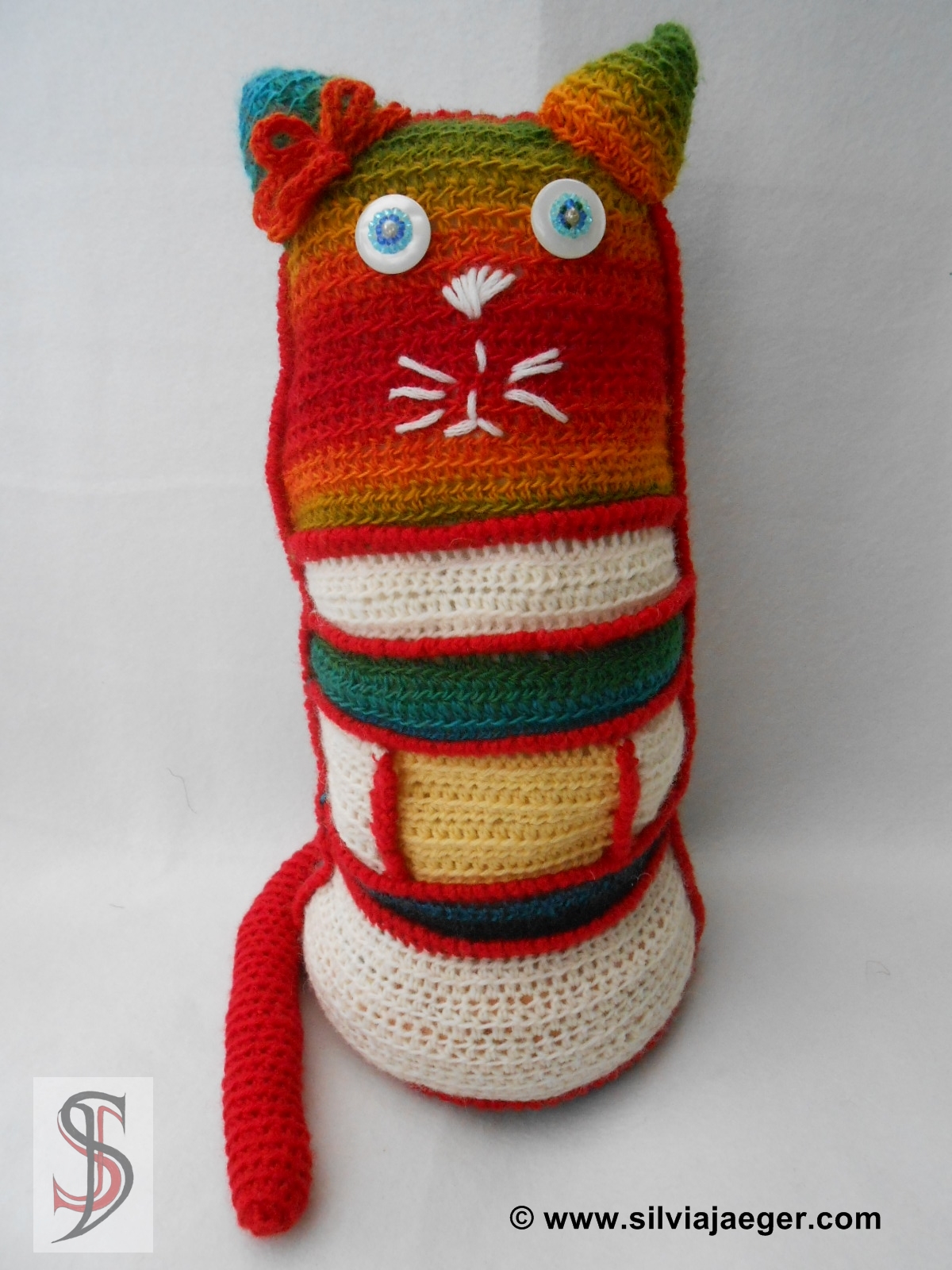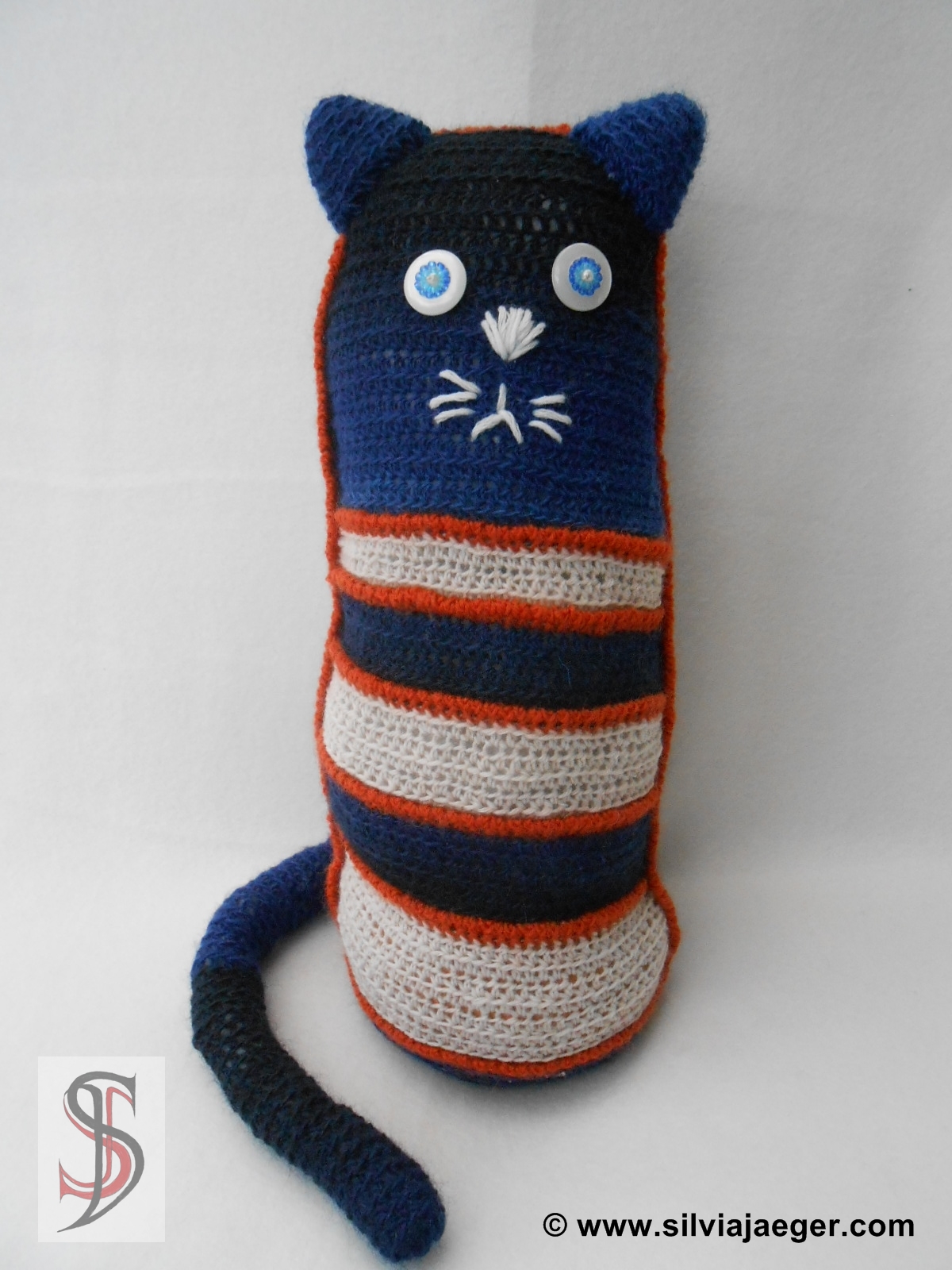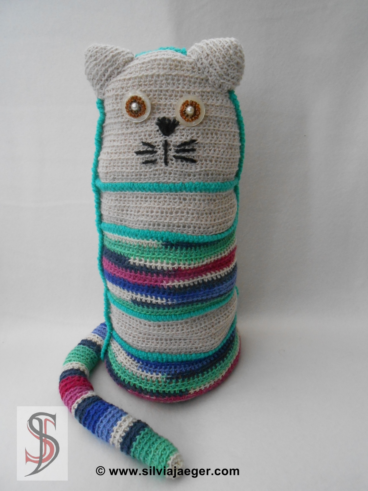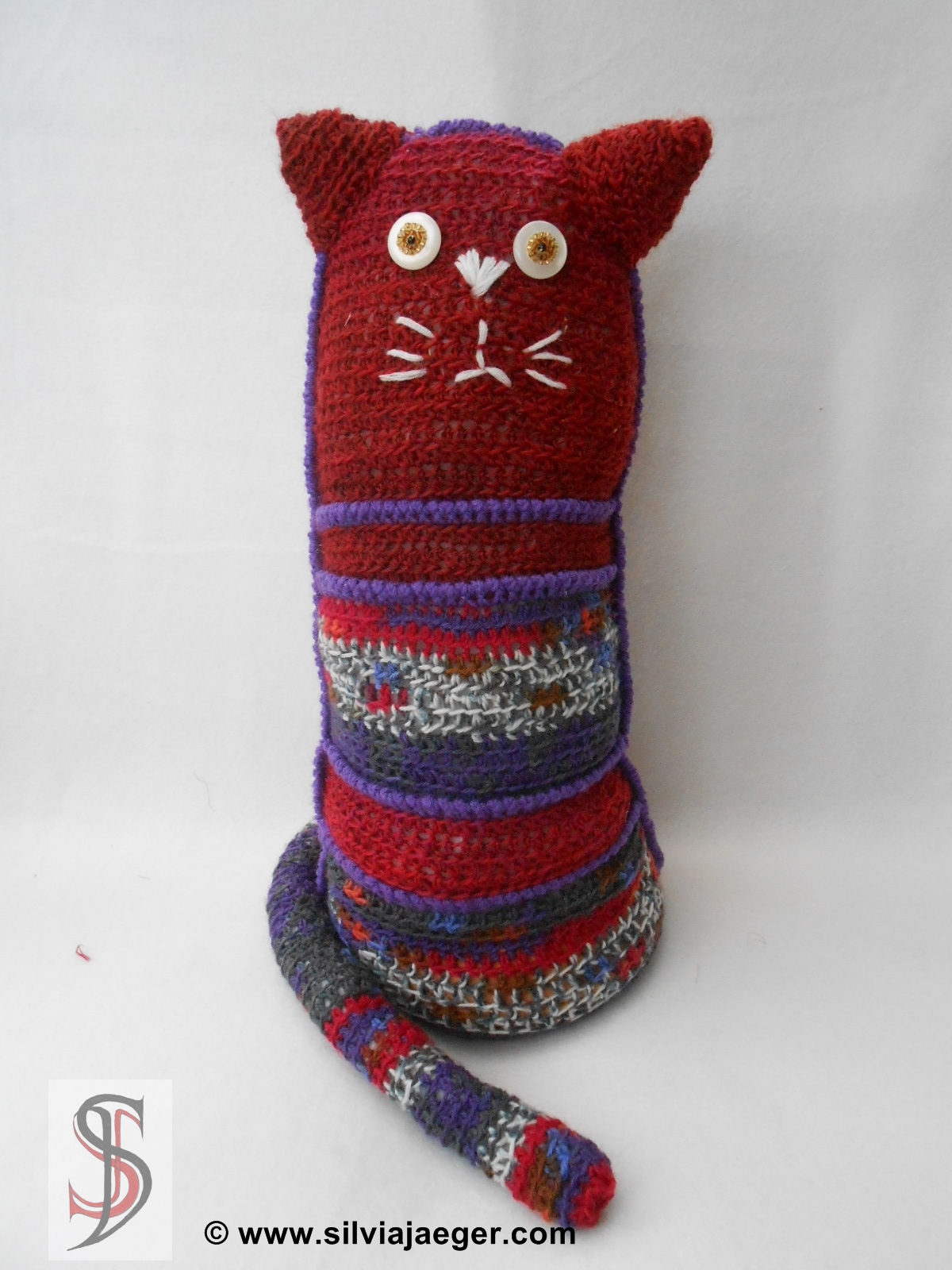 Als Anfang benötigt man einen Kreis. Mit der halben Maschenanzahl häkelt man das Rückenteil weiter, bis man die gewünscht Höhe erreicht hat. Für den Kopf dann einfach in jeder Reihe 1 Masche weniger häkeln bis man die halbe Maschenanzahl hat. Für das Vorderteil kann man nun verschieden große Rechtecke mit der gleichen Maschenanzahl des Rückenteiles häkeln. Die Größe der Rechtecke ist beliebig, man sollte am Ende insgesamt die gleiche Reihenanzahl wie beim Rückenteil haben. Das Kopfteil auch seperat häkeln und die Abnahmen genau wie beim Rückenteil ausführen. Nun werden mit einer Kontrastfarbe alle Rechtecke des Vordrteiles zusammengehäkelt und dann wird das Vorderteil an das Rückenteil und an den Boden angehäkelt. Bevor man ganz mit dem Zusammenhäkeln fertig ist, natürlich das Auststopfen der Katze nicht vergessen.