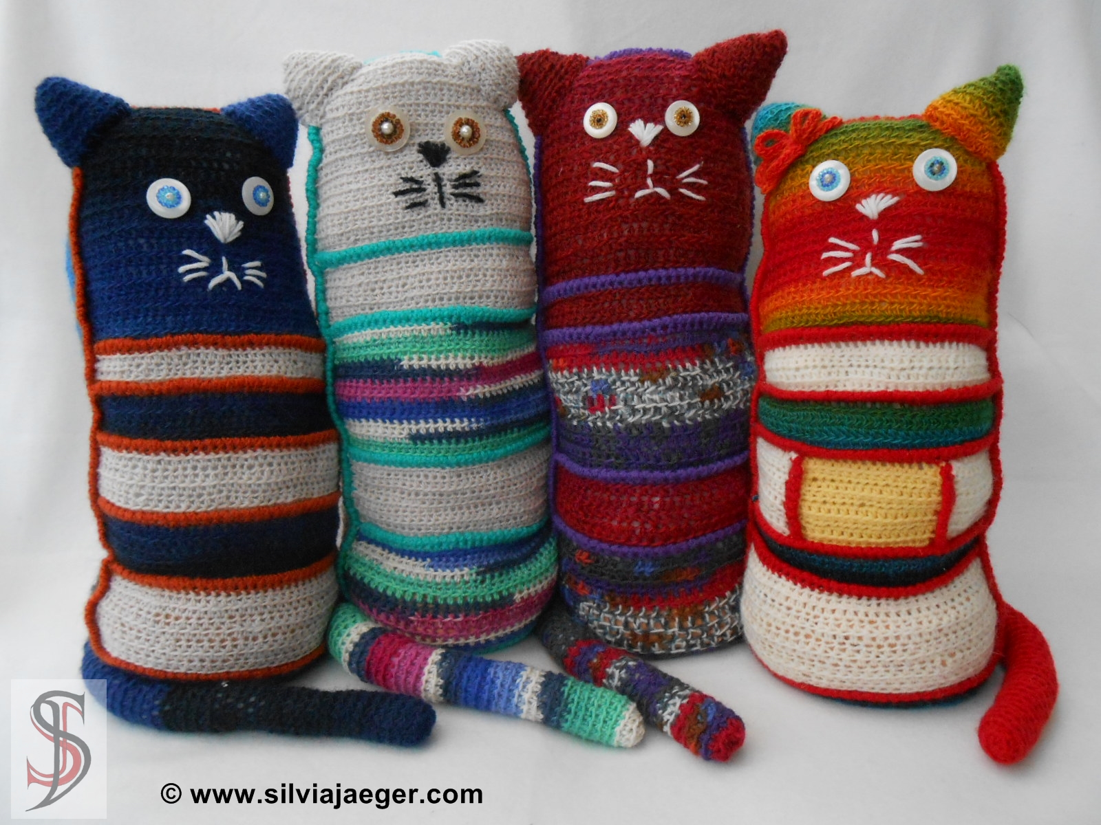 Das Häkeln ist auch gar nicht schwer und jede Katze kann je nach verfügbarer Wollrestmenge größer oder kleiner gehäkelt werden. Ich habe auschließlich Sockenwolle verwendet. Die Katzen sind aber auch mit jeder anderen Wollsorte herzustellen. Man sollte nur darauf achten, dass man Wollreste mit etwa der gleiche Lauflänge verwendet. Natürlich lassen sich hier mehrere Farben super kombinieren.