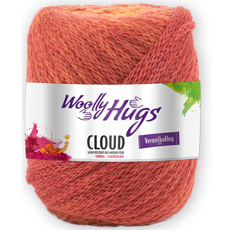 Die Cloud besteht zu 94 % aus Merinowolle und 6 & Polyamid. Es ist ein leichtes und überraschend weiches Garn. Ein Knäuel hat eine Lauflänge von 300 m/100 g und gestrickt wird mit Nadelstärke 5,5-6,5. Das Knäuel hat einen Farbverlauf über das ganze Knäuel die Farben verlaufen von Orange bis Gelb.