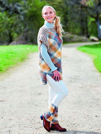 Der Pullunder ist in Einheitsgröße von 36 – 42. Man benötigt für den Pullunder 500 g und für die Stulpen 100 g.