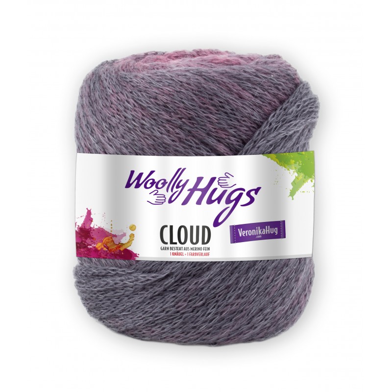 Die Cloud besteht zu 94 % aus Merinowolle und 6 & Polyamid. Es ist ein leichtes und überraschend weiches Garn. Ein Knäuel hat eine Lauflänge von 300 m/100 g und gestrickt wird mit Nadelstärke 5,5-6,5. Das Knäuel hat einen Farbverlauf über das ganze Knäuel die Farben verlaufen von Grau bis Beere.