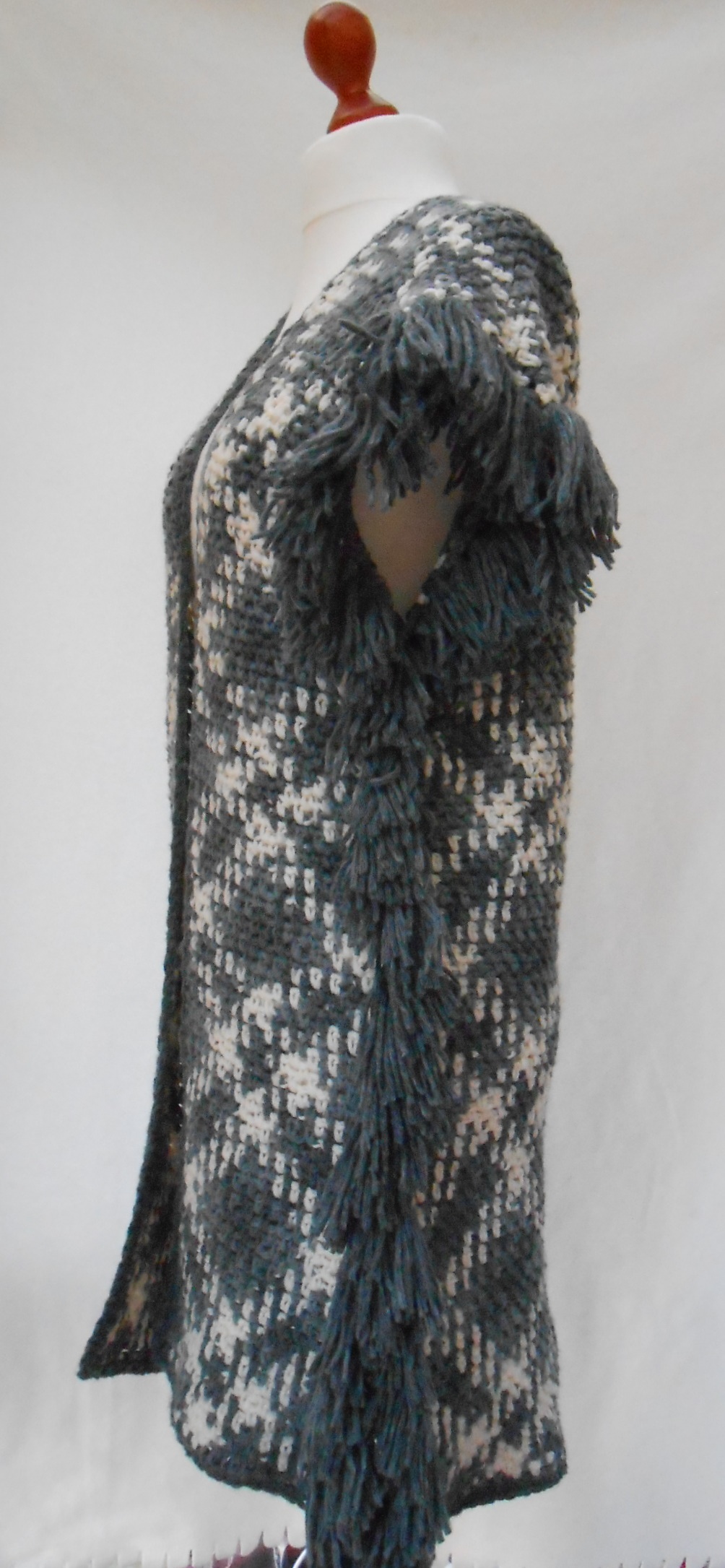 - An die Seitenschlitze, an die Seitennähte und an den Ärmelöffnungen werden Fransen angebracht.