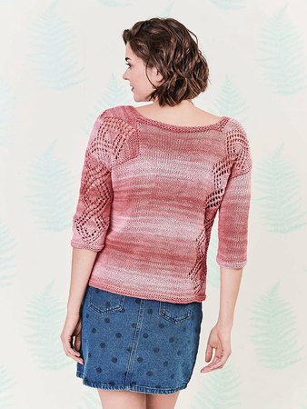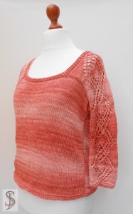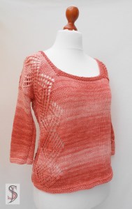Die BANDY WISH besteht zu 100% aus Baumwolle und ist ein leichtes Bändchengarn. Ein Knäuel hat eine Lauflänge von 210 m/100 g und gestrickt wird mit Nadelstärke 5-6. Der Farbverlauf reicht von einem kräftigen bis zu einem pestelligen Lachs-Tönen. Das Garn ergibt einen zarten Streifeneffekt, das das Modell sehr lebendig und frisch erscheinen lässt.