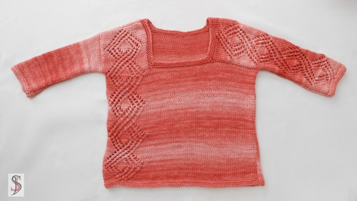 - Der linke Ärmel führt bis zur Schulter und der rechte Ärmel wird an des Oberteil angesetzt.